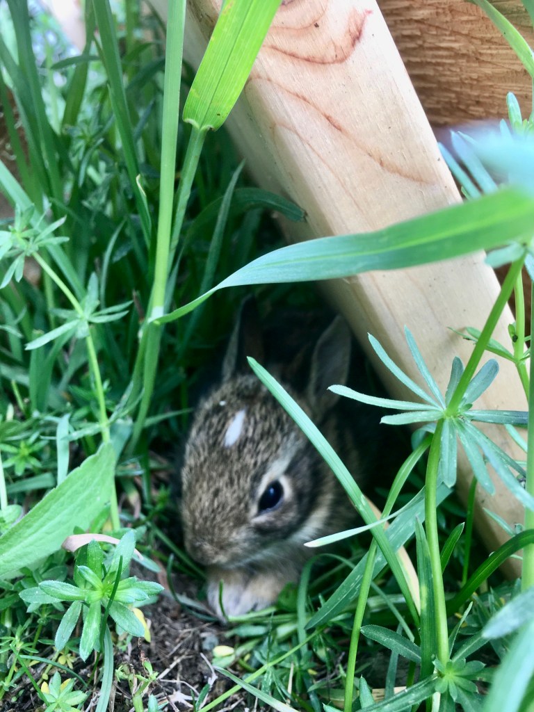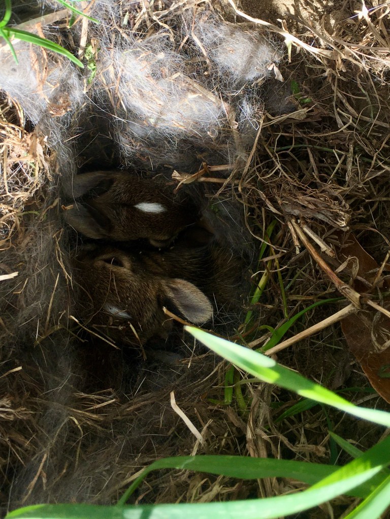 Within the week, the bunnies’ eyes were open and their bodies had fur, including a cute white star on the forehead. By the following week, they were starting to crowd each other, though stayed hunkered down in their warm bunker. The week after that, some of the buns had ventured out of to nest to chill under the classy two-by-fours blocking the nest from certain destruction by lawnmower.