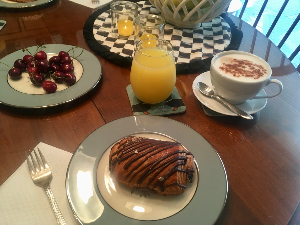 Y’all, it was delicious. Every single thing: the croissant, the juice, the music, the mood. And, in dedication to the pleasure principle, I enjoyed every bite of my authentic pain au chocolat (puff pastry rectangle filled with chocolate sticks) without worrying or feeling guilty. Life is too short! It’s the weekend and I was looking forward to a tasty treat in all of its buttery, chocolately, flaky goodness.