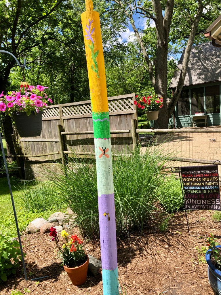 This spring, my Aunt Marti painted and decorated this pole in her beautiful garden in central Illinois.