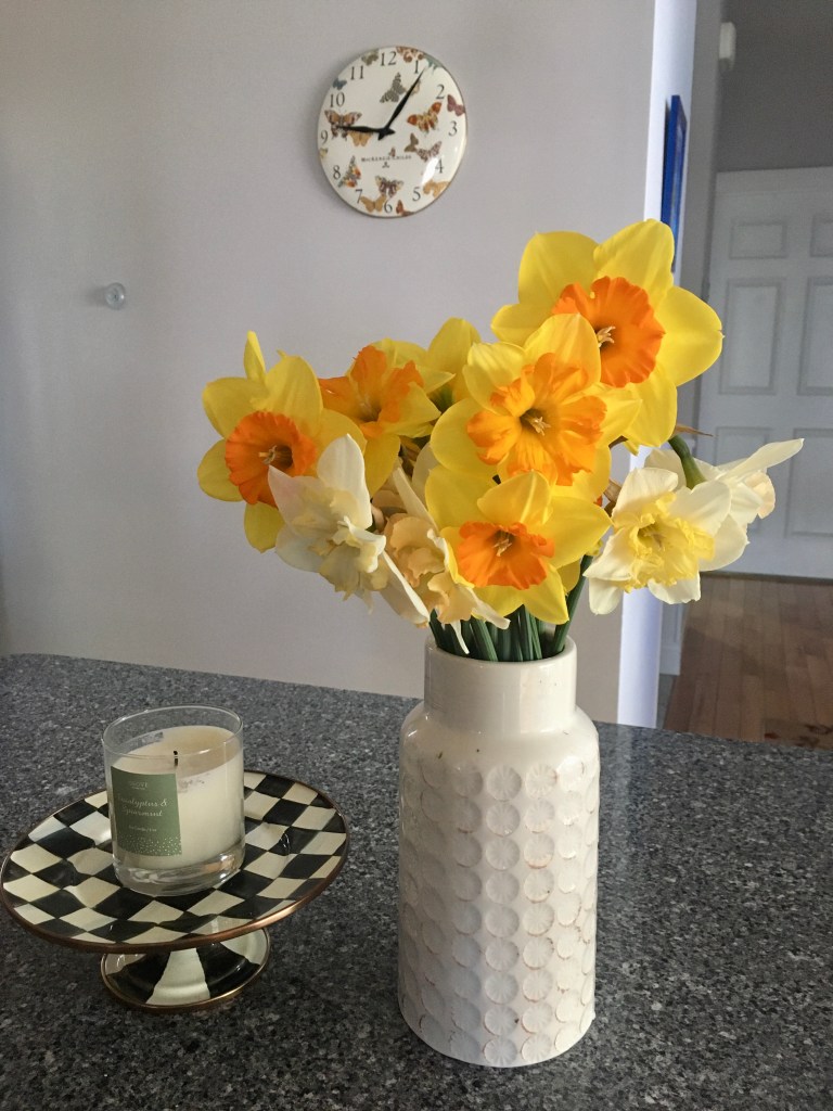 I cut the daffodils as soon as new ones bloomed and placed them in vases around the house. If we’re going to be at home all the time (All. The. Time.), it might as well look pretty!