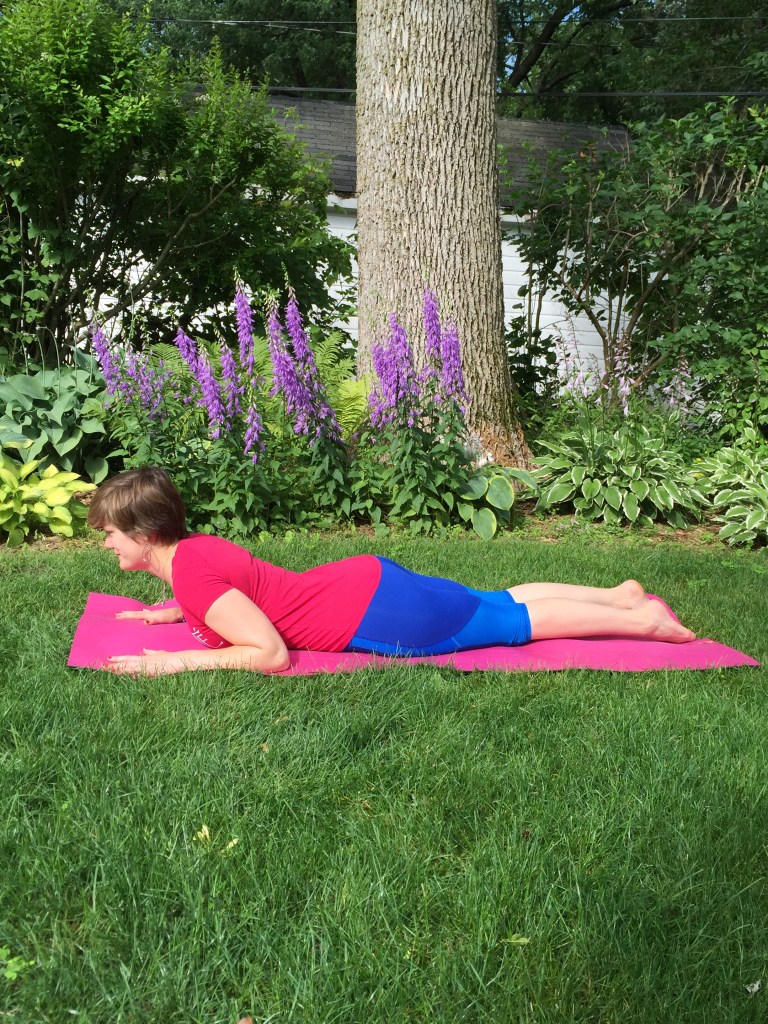 Next, try Baby Cobra and Cobra. From your seated position, make your way onto your stomach. Let the chin rest on the floor and draw the big toes together. Place the arms under the shoulder blades and tuck your elbows tightly in by your ribs. Take a deep breath in to center. Exhale.