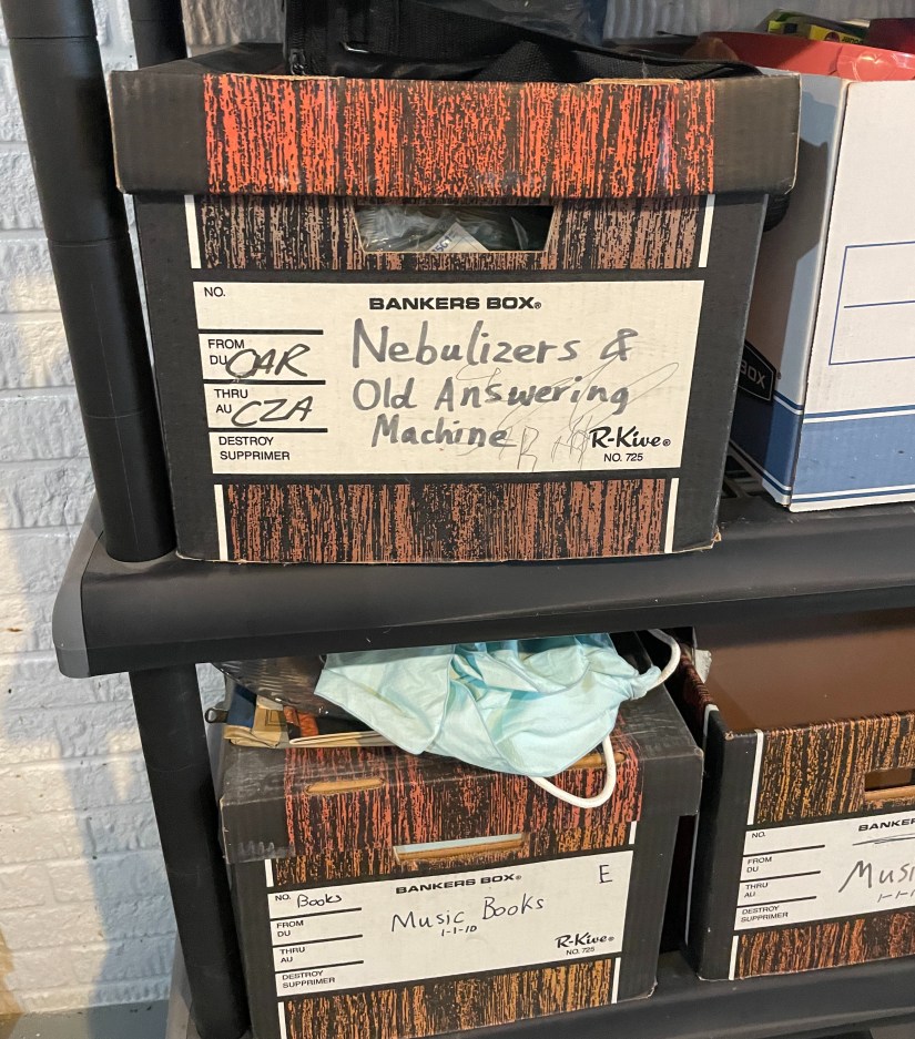 The home we ended up purchasing also had some gems in the basement storage room. Bankers boxes full of music books and then, randomly, one for Nebulizers & Old Answering Machines. So many queries here. Why did they keep not just one but multiple old answering machines?