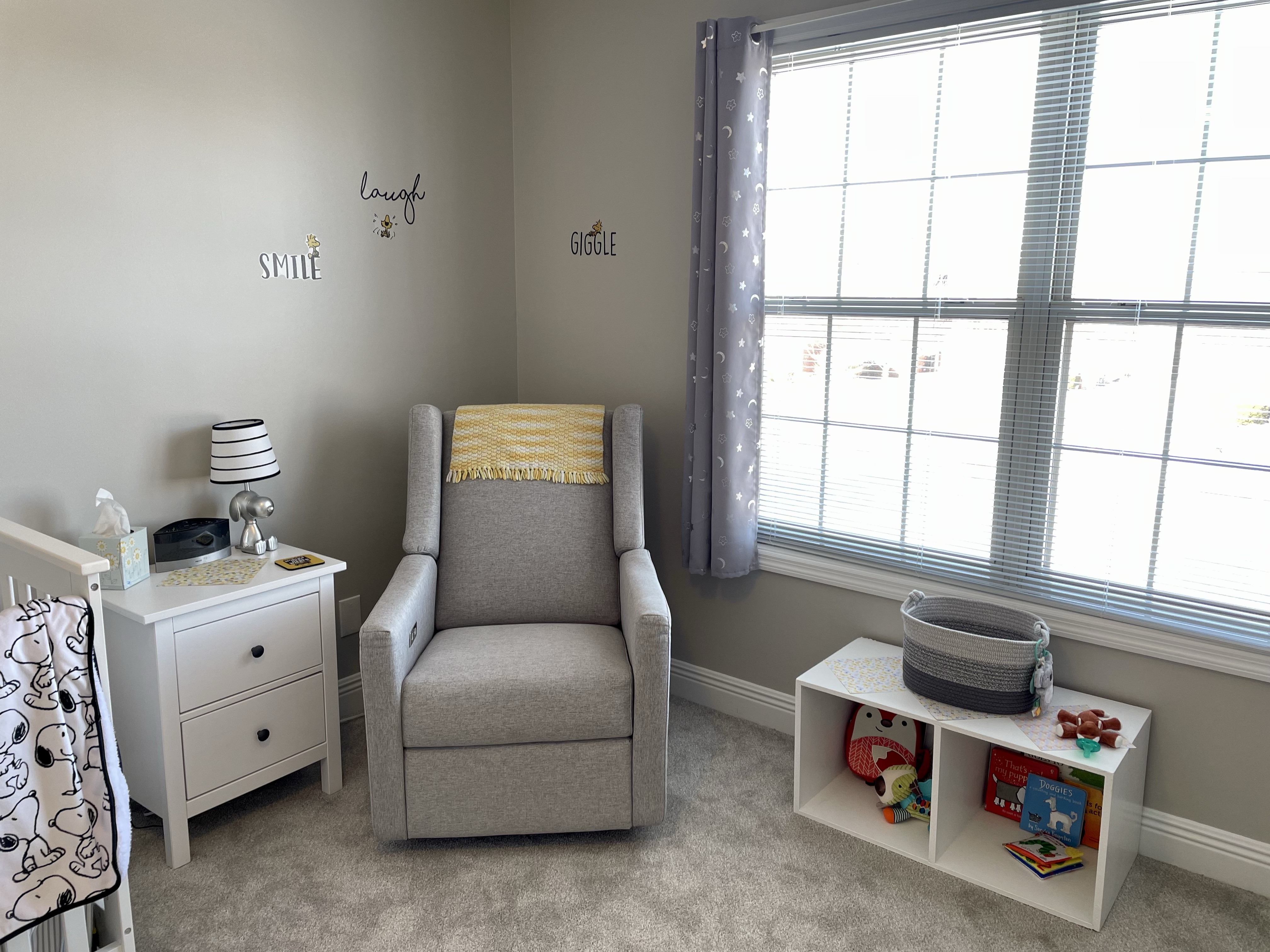 New: crib from Target (N.B.: always buy a new crib, except in very limited circumstances); recliner from Babyletto; and dresser, nightstand, and rug from IKEA.