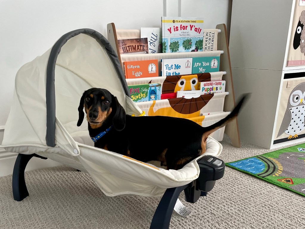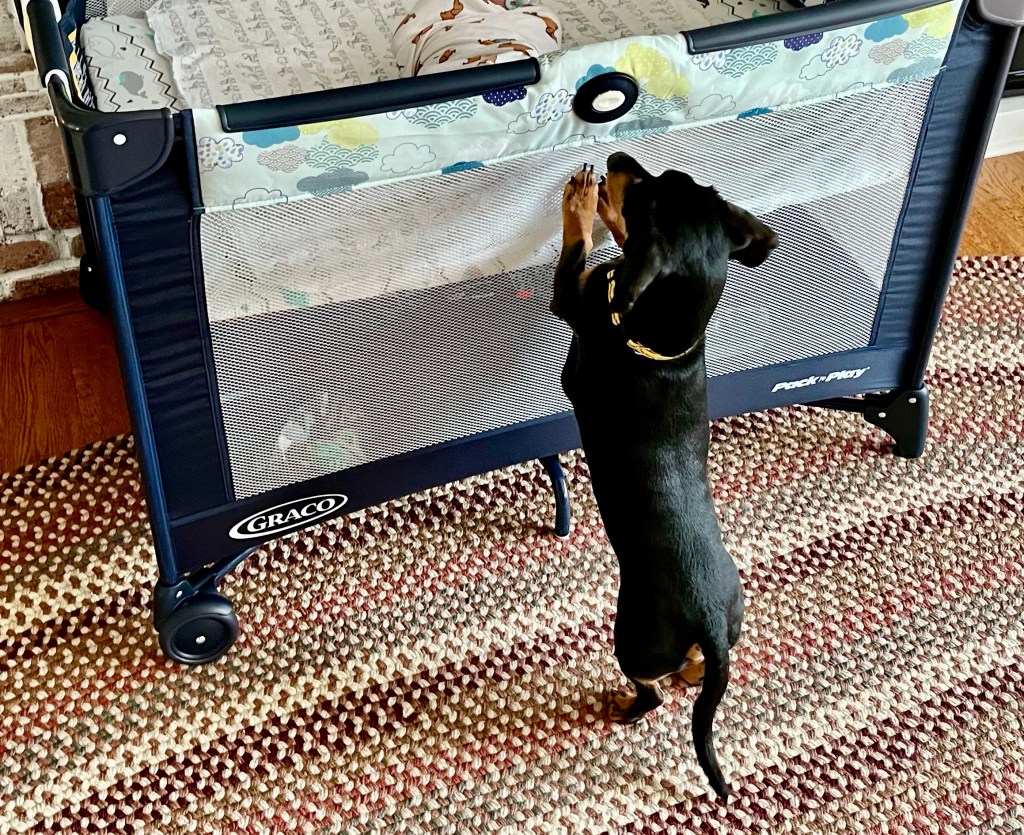 This approach worked for a while, but after about six weeks, having a new bébé in the house all the time took its toll on the hound. He became anxious (more than usual), shadowed me (more than usual), and ratcheted up the separation anxiety and stranger danger (more than usual). In short, he was starting to flippé.